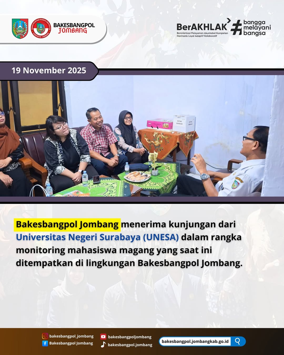 Jombang, 19 November 2025 — Bakesbangpol Kabupaten Jombang menerima kunjungan dari Universitas Negeri Surabaya (UNESA), khususnya dari Program Studi Sosiologi, dalam rangka monitoring mahasiswa magang yang saat ini ditempatkan di lingkungan Bakesbangpol Jombang.