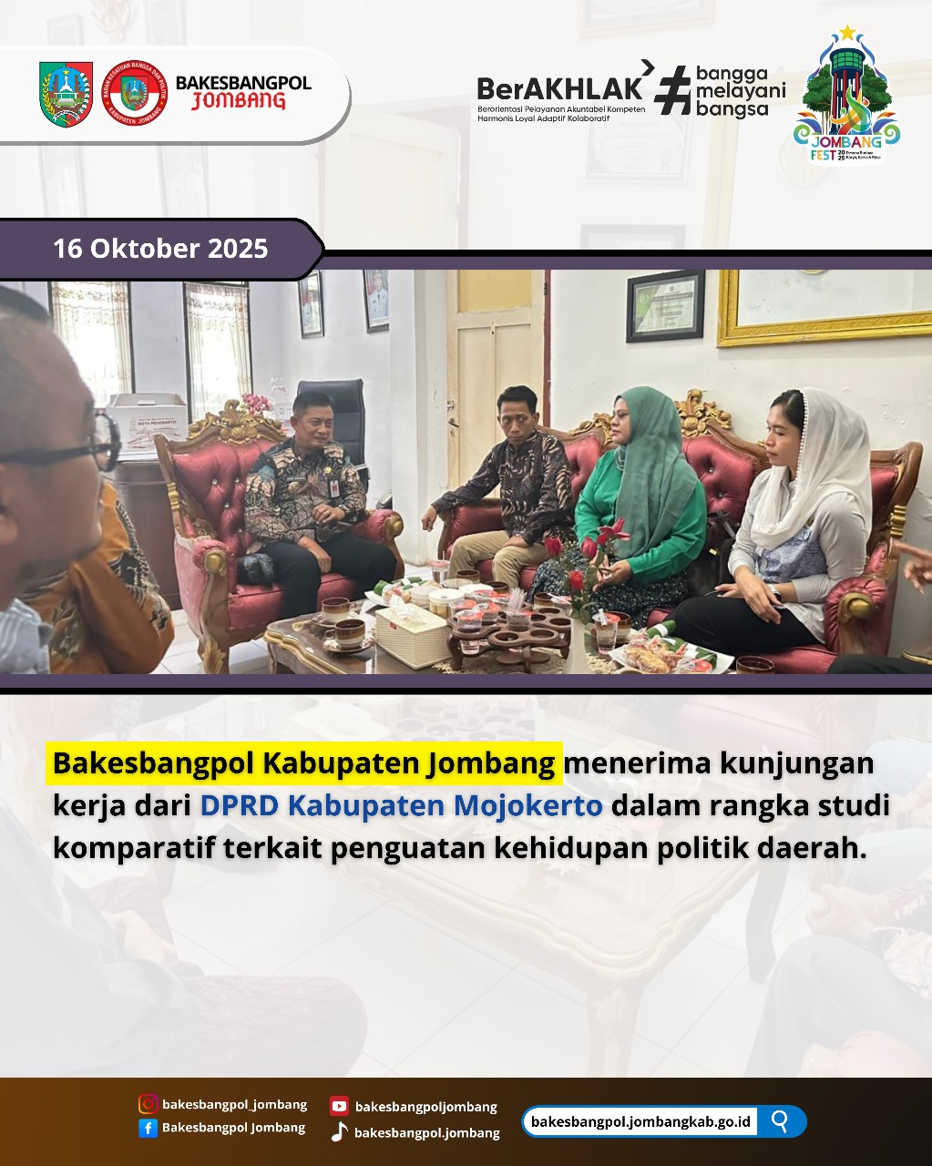 Jombang, 16 Oktober 2025 – Bakesbangpol Kabupaten Jombang menerima kunjungan kerja dari DPRD Kabupaten Mojokerto dalam rangka studi komparatif terkait penguatan kehidupan politik daerah, bertempat di ruang kerja Kepala Bakesbangpol Kabupaten Jombang.