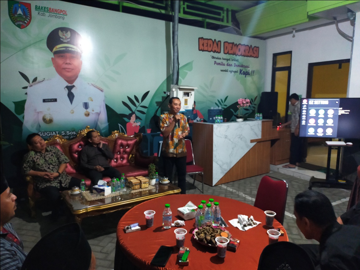Sosialisasi Pendidikan Politik oleh Bakesbangpol kepada Perguruan Silat Se- Kabupaten Jombang, melalui kegiatan Ngopi Bareng Bersama KPU dan Bawaslu Kab. Jombang, dalam rangka meningkatkan peran serta atau partisipasi masyarakat dan Ormas/LSM/OMS serta generasi muda pada Pemilihan Umum Legislatif, Pemilihan Presiden dan Pilkada Tahun 2024, diikuti sekitar 50 orang.
