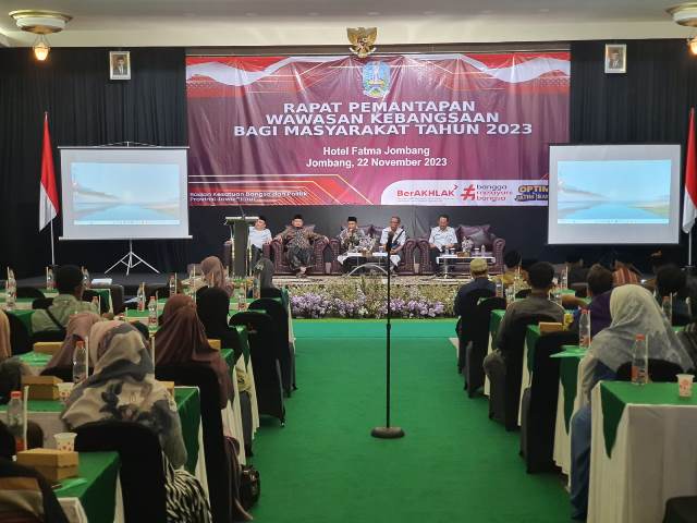 Jombang, 23 November 2023 - Badan Kesatuan Bangsa dan Politik (Bakesbangpol) Pemerintah Provinsi Jawa Timur menggelar rapat pemantapan wawasan kebangsaan bagi masyarakat tahun 2023 di Hotel Fatma, Jombang, Rabu (22/11/2023). Rapat ini diikuti oleh 200 orang peserta dari berbagai kalangan, termasuk unsur pemerintah, tokoh masyarakat, dan perwakilan organisasi kemasyarakatan.