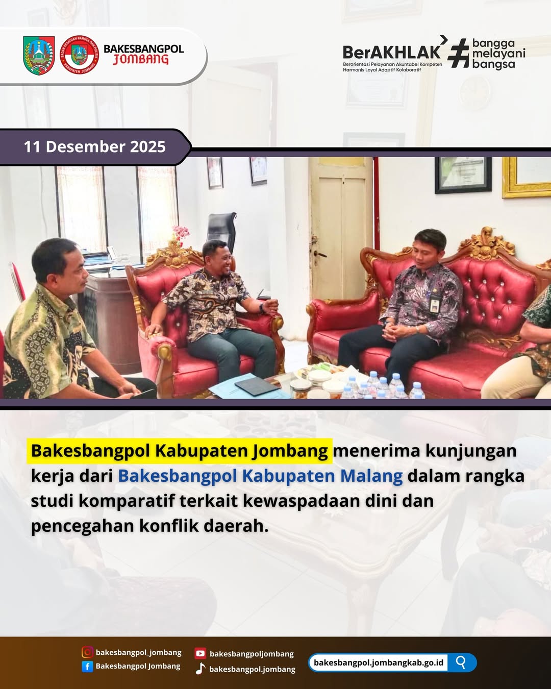 Bakesbangpol Kabupaten Jombang Menerima Kunjungan Kerja dari Bakesbangpol Kabupaten Malang Dalam Rangka Studi Komparatif Terkait Kewaspadaan Dini dan Pencegahan Konflik Daerah